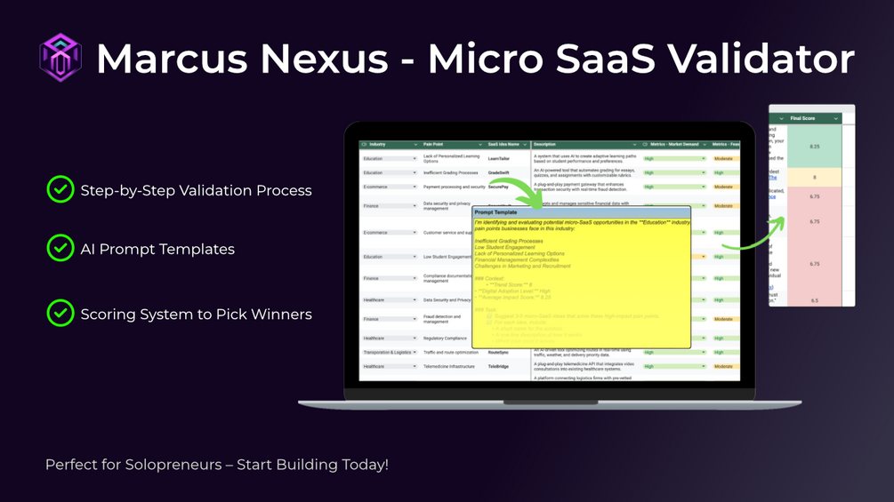 Validate your micro-SaaS ideas fast with Marcus Nexus! This spreadsheet + instructions uses AI prompts to guide you step-by-step. Rank ideas with an automated scoring system—only $10! Includes downloadable files and a Google Sheet version (make a copy to edit).